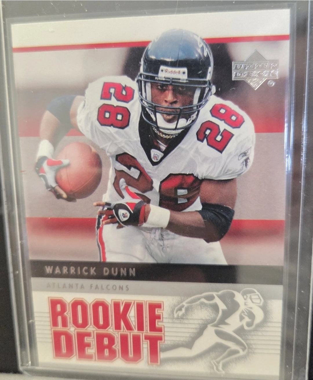 The product is a 2005 Upper Deck Rookie Debut trading card featuring Warrick Dunn from the Atlanta Falcons in the National Football League (NFL). This card is part of the base set and is not autographed. It is a valuable sports trading card collector's item in near mint condition, making it a desirable addition to any football card collection.