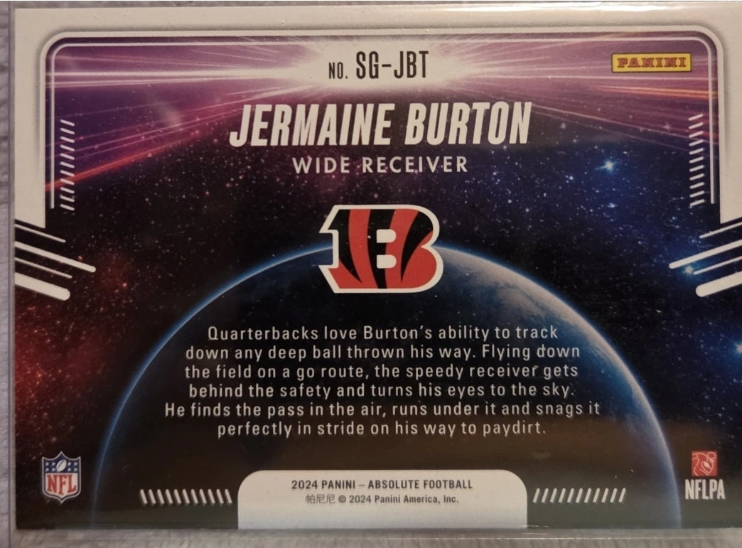 The 2024 Panini Absolute Star Gazing Jermaine Burton #SG-JBT (RC) trading card is a football collectible featuring the rookie athlete from the Cincinnati Bengals. This sports trading card is part of the Star Gazing insert set in the 2024 Panini Absolute collection. As an ungraded card in near mint or better condition, it is a sought-after item for NFL fans and collectors looking to add a piece of sports memorabilia to their collection.