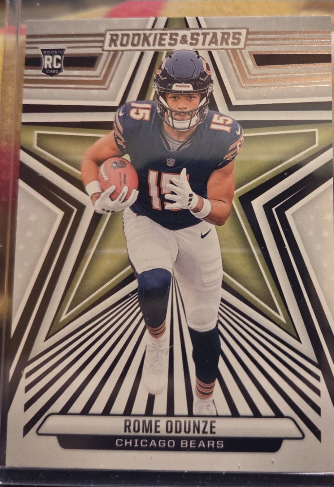 The 2024 Panini Rookies & Stars trading card featuring rookie player Rome Odunze, card number 186, is a standard-sized card made of card stock. This original sports trading card is part of the base set for the National Football League (NFL) and is not autographed. Manufactured by Panini in the United States, this English-language card is ideal for collectors who are fans of the Chicago Bears and the NFL. With a near mint or better condition, this card is a valuable addition to any football card collection.