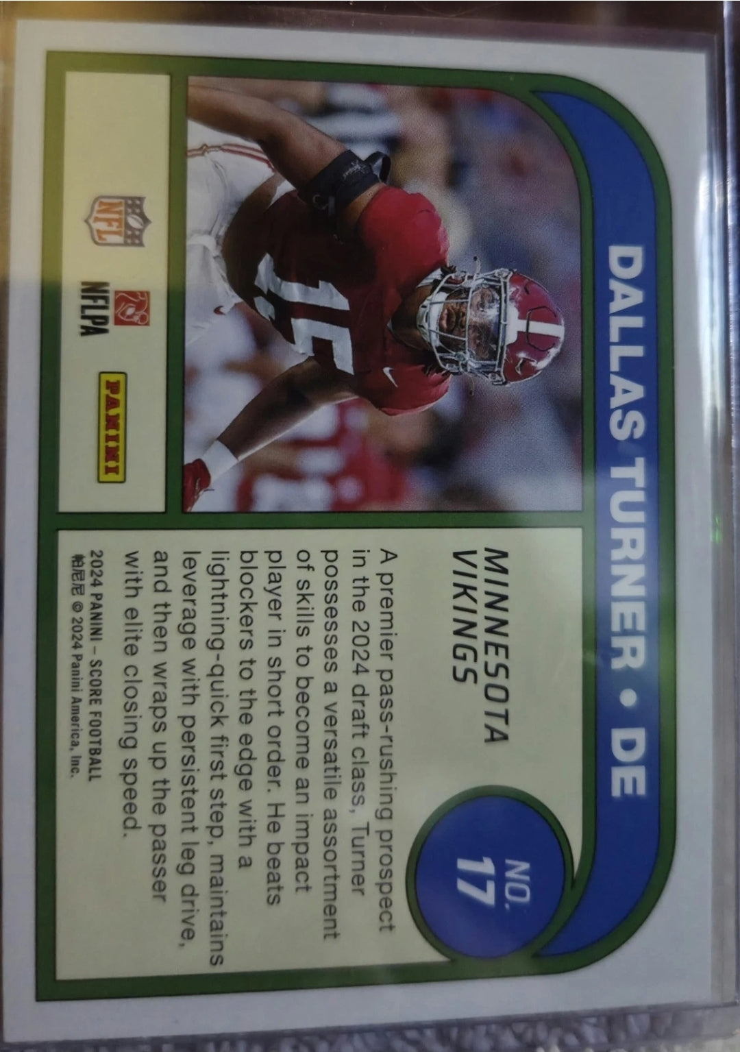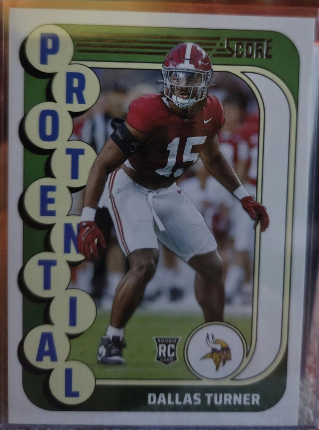 The product is a 2024 Score sports trading card featuring Dallas Turner #17, a rookie player for the Minnesota Vikings in the National Football League (NFL). This card is part of the "Protential" insert set by Panini, known for its high-quality football cards. It is in near mint or better condition and comes unautographed, making it a valuable addition to any sports card collection.